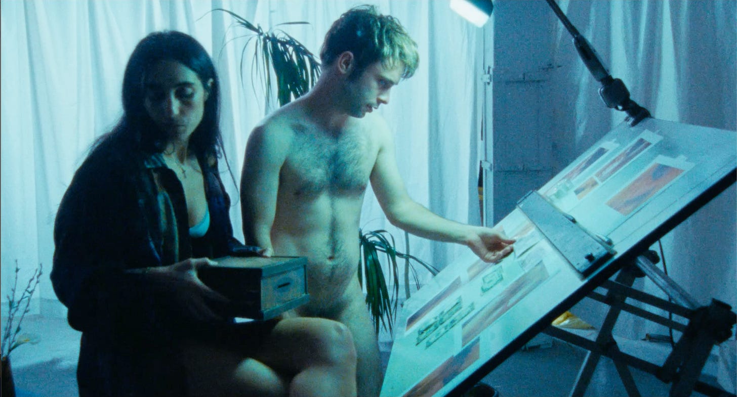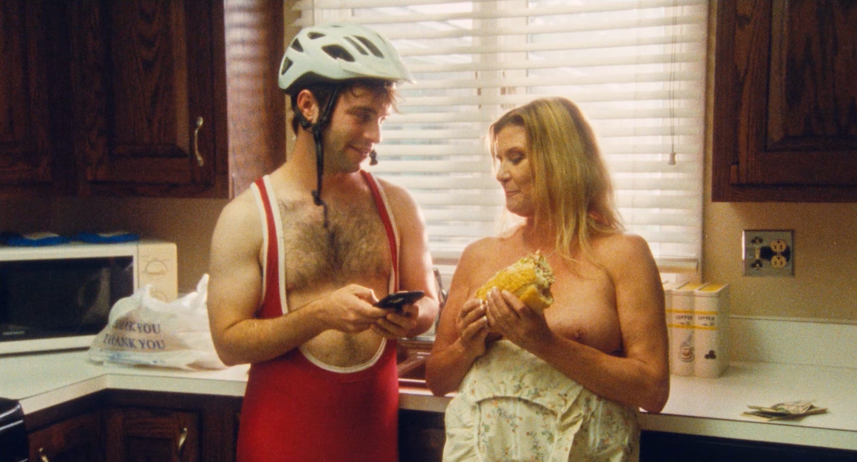 Alex Phillips: I worked in food delivery a while ago now, like fresh out of college. I was a philosophy major. That got me into the wonderful world of food service and fast food. I was kind of bumming around and delivering sandwiches to people, and I found that a lot of the clients that I was delivering to were shut-ins and, like, extremely horny. And I was a nubile 22 year old. I was in a weird position where I was objectified and it was new to me, leaving an environment and my peers and being ogled by different people out in the real world. It threw me for a loop and I started writing about it. And also taking it further, like, imagining what it would be like to actually fuck these people… it’s not my desire, it would be for them. But then what would it be like to give them what they wanted and needed? But I also saw that they were very lonely, and I was also especially lonely at this time. Like, you bring them food, and they’re shut-ins a lot of the time, so it’s like bringing the outside world to them and making them feel less lonely. So it’s not just about sex, I wasn’t just thinking about it in a pizza delivery, big sausage pizza, porn way. It was like, what would it be like to make these people feel emotionally complete? In giving them food and company and all that? And then cranking it up a notch for Liam in the movie, where it’s almost a holy experience.
